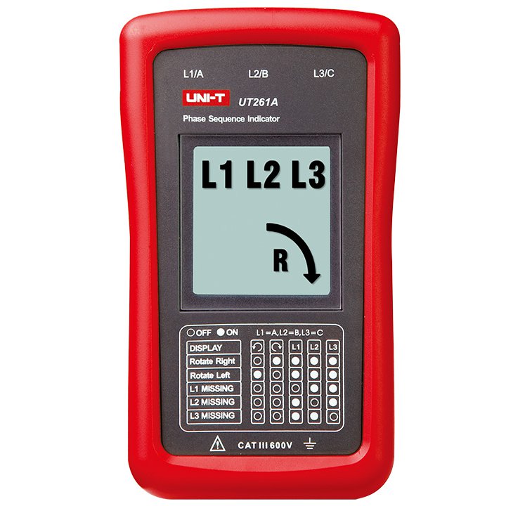 Seria UT261 este utilizata pentru determinarea secventei fazelor de putere trifazate, indicarea fazei lipsa si rotatia fazelor motorului (UT261B). UT2