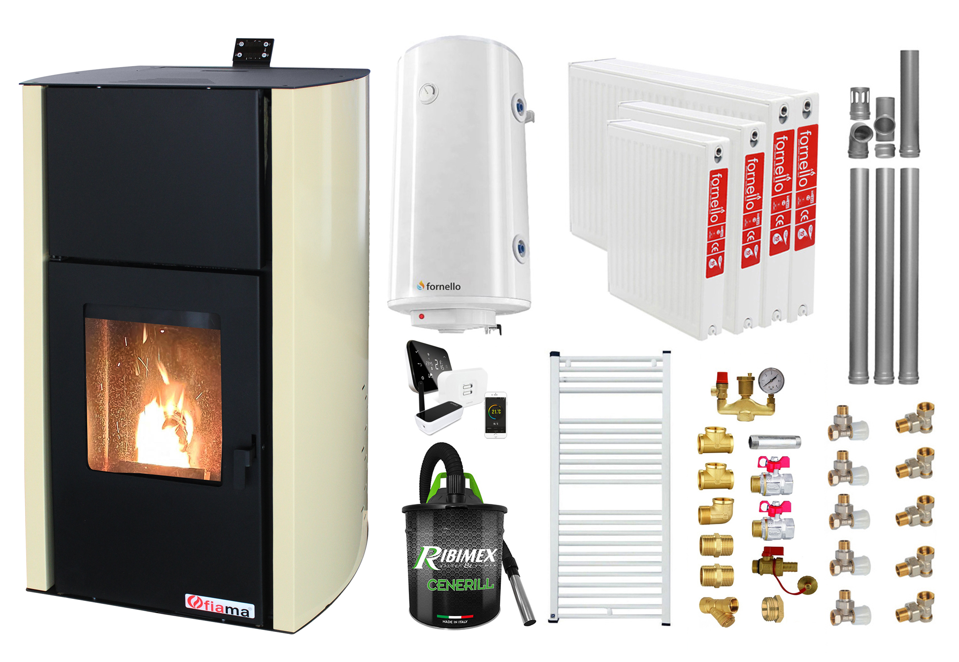 Pachet control de la distanta Termosemineu pe peleti Fornello Fiama Confort 18 kw Pompa Vas expansiune Automatizare Radiatoare otel Boiler 100 litri Termostat Aspirator Kit 3.5 ml si Fitinguri montaj