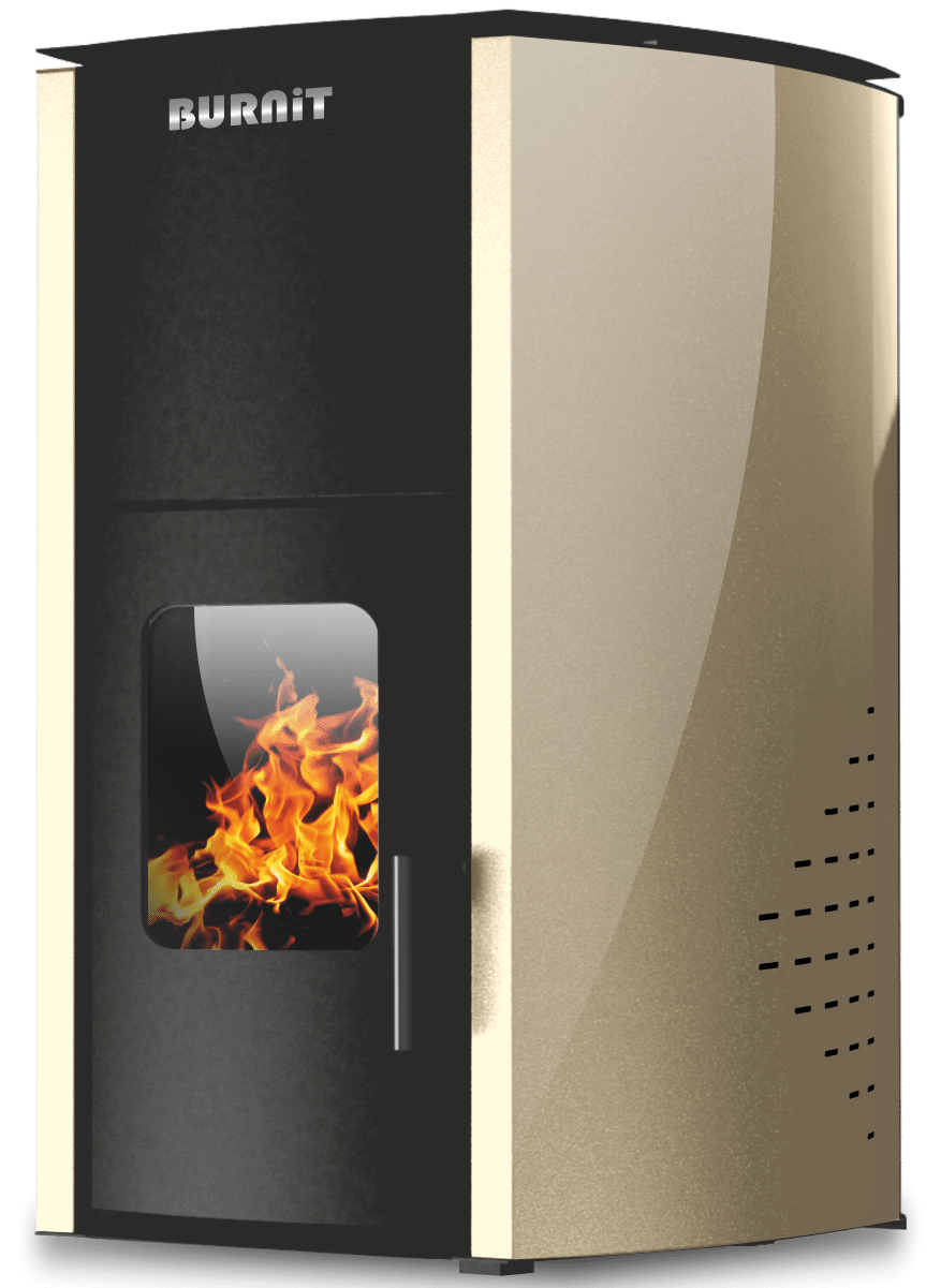 Termosemineu pe peleti Burnit Comfort 18 kw complet echipat pentru incalzire pompa vas expansiune automatizare buncar peleti 15 kg tiraj fortat culoare Crem aprindere automata pana la 120 mp